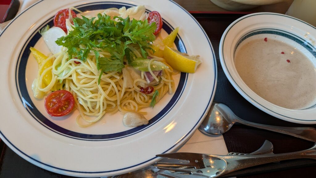 私:野菜のパスタ&スープ
