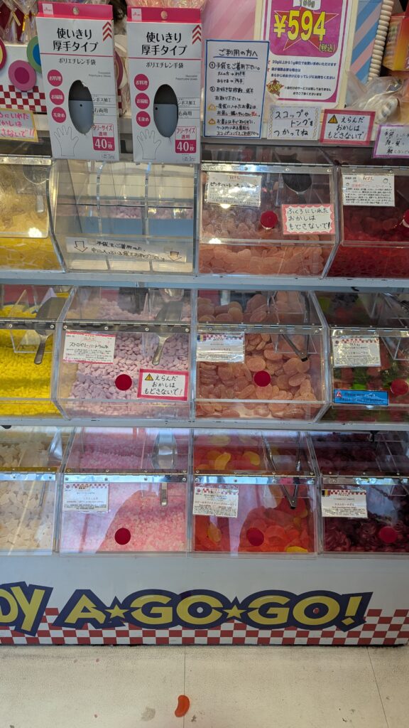 ラムネやグミ、ガムやマシュマロなどカラフルなお菓子が沢山ある、量り売りのお店です!